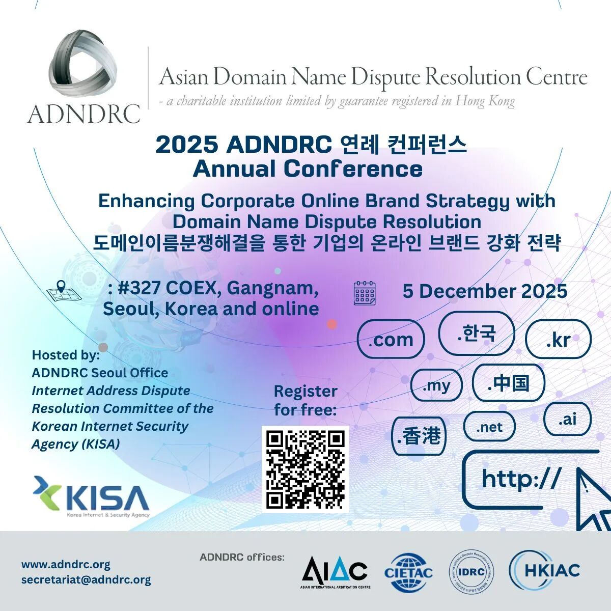 本次年度会议(연례 컨퍼런스)由ADNDRC首尔办公室,韩国互联网安全机构之互联网址争议解决委员会(KISA-IDRC)主办。会议主题:通过域名争议解决,强化企业在线品牌战略(도메인이름분쟁해결을 통한 기업의 온라인 브랜드 강화 전략)——探索亚洲域名保护前沿趋势与实战策略形式:线上或线下参会注册:扫描图上二维码或跳转链接(https://hkiac.glueup.com/event/asian-domain-name-dispute-resolution-centre-annual-conference-156240/),以锁定席位,获取会议最新动态